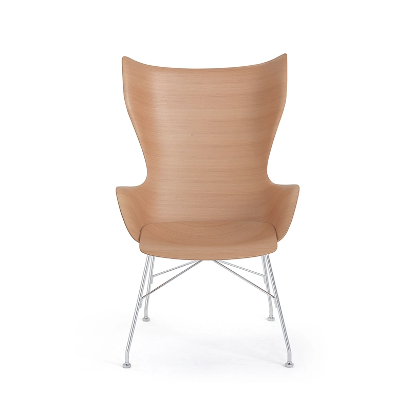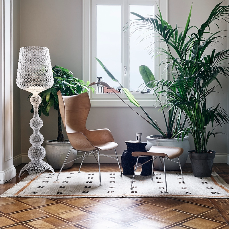 The Smart Wood collection is the outcome of Kartell's unremitting research into the possibility of giving three dimensional form to a material which so far has always been two dimensional. Using patented technology, the wood is worked with a mold designed to bring the curvature of the panel to the very edges, creating a seat with sinuous roundness, K/Wood is a royal style armchair complemented by the matching S/wood footrest with the same finish.